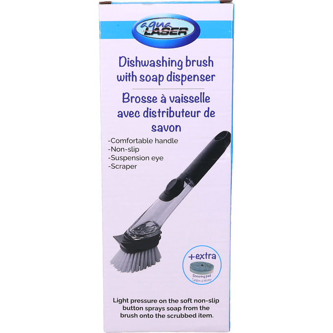 Aqua Laser diskborste är det ultimata verktyget för en effektiv rengöring vid diskhon. Med en inbyggd dispenser fyller du enkelt handtaget med diskmedel, och genom ett lätt tryck på den mjuka, halkfria knappen sprayas precis rätt mängd medel direkt på disken. Ingen mer onödigt slöseri med diskmedel eller kladdiga flaskor!