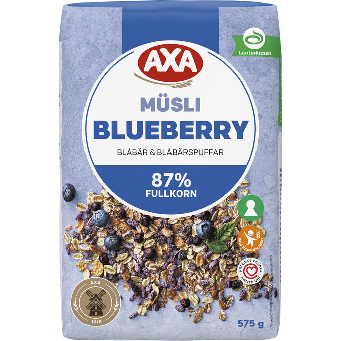 AXA Blueberry Müsli innehåller goda blåbär i tre varianter: blåbärspuffar, blåbärsgranulat och frystorkade blåbär. Ett härligt smakäventyr för blåbärsälskaren med hela 87% fullkorn.