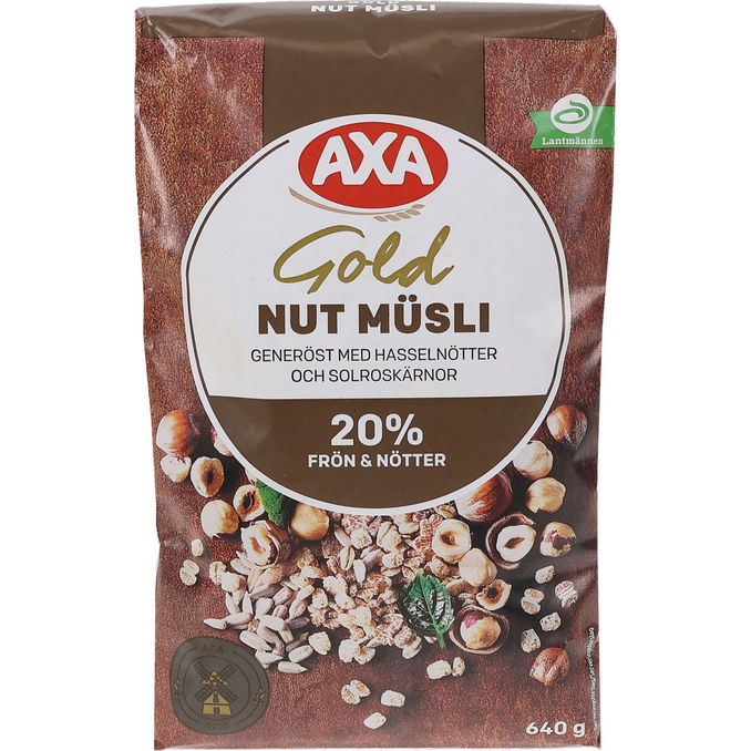 AXA Gold Müsli Nut är en müsli för dig som tycker om rostade hasselnötter och solrosfrön i en frasig blandning av havreflakes och havrepuffar med smak av nougat. Müslin innehåller 20% frön och nötter.