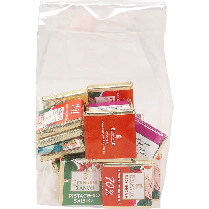 Njut av chokladkonfektyr från Bernardi i en charmig cellofanpåse - perfekt som present eller del av godishyllan. Chokladen är omsorgsfullt tillverkad med högkvalitativ choklad som ger en len och rik smakupplevelse.