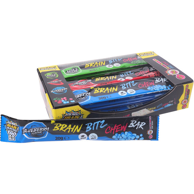En färgsprakande tuggbar godisstång med smaker av äpple, vattenmelon och blåbär. Den är fylld med syrlig karamell och bjuder på en intensiv och lekfull smakupplevelse.