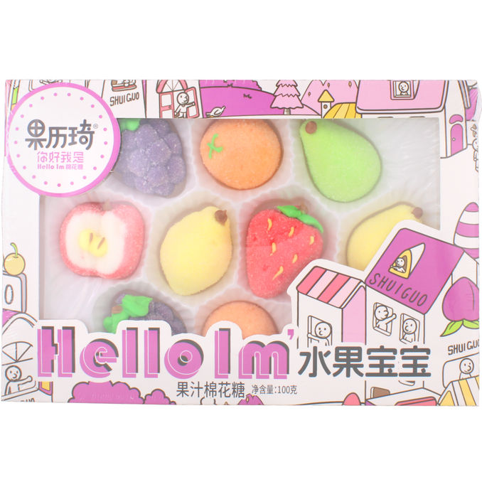 Mjuka och färgglada marshmallows formade som olika frukter med söt och lekfull smak. Perfekt som godis till kalas, present eller för att pigga upp vardagen.