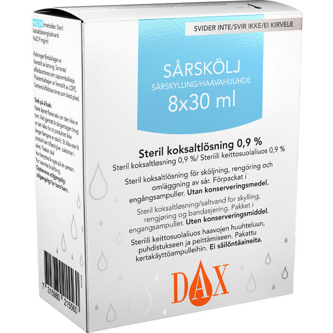 Steril koksaltlösning för sköljning och rengöring av sår som är skonsam och inte svider. Praktiskt förpackad i engångsampuller utan konserveringsmedel för hygienisk och säker användning.