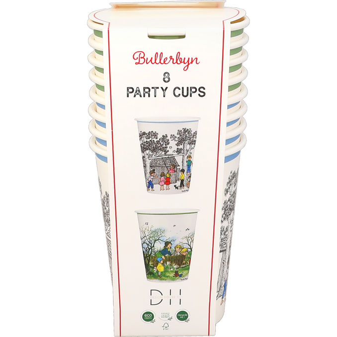Pappersmuggar med charmigt Bullerbyn motiv i praktiskt 8 pack som rymmer 250 milliliter. Perfekta för barnkalas, picknick eller fest där du vill ha en enkel och stämningsfull dukning.