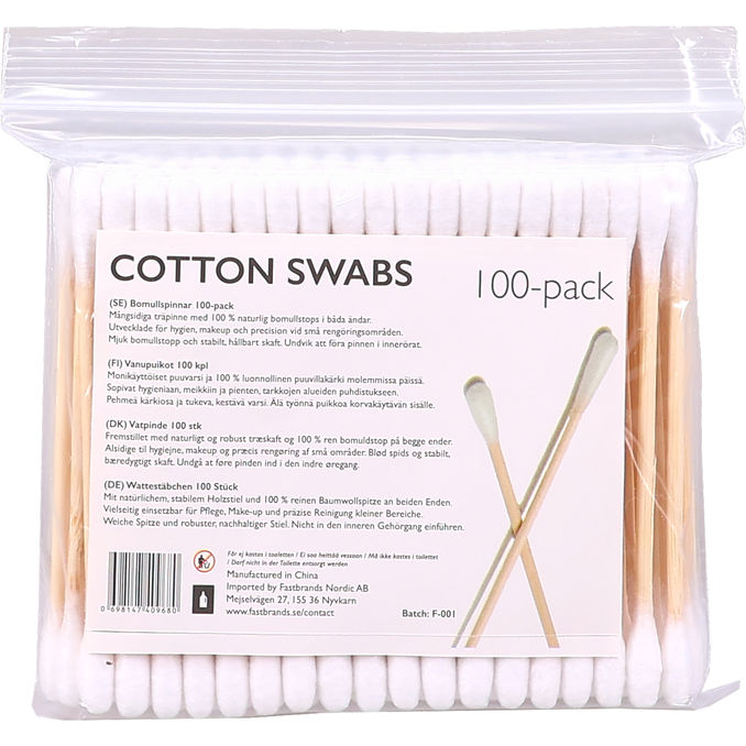 Bomullspinnar med mjuka toppar av 100 procent bomull och stabilt skaft för enkel och precis användning. Passar perfekt för hygien, makeup och rengöring av små och svåråtkomliga områden.