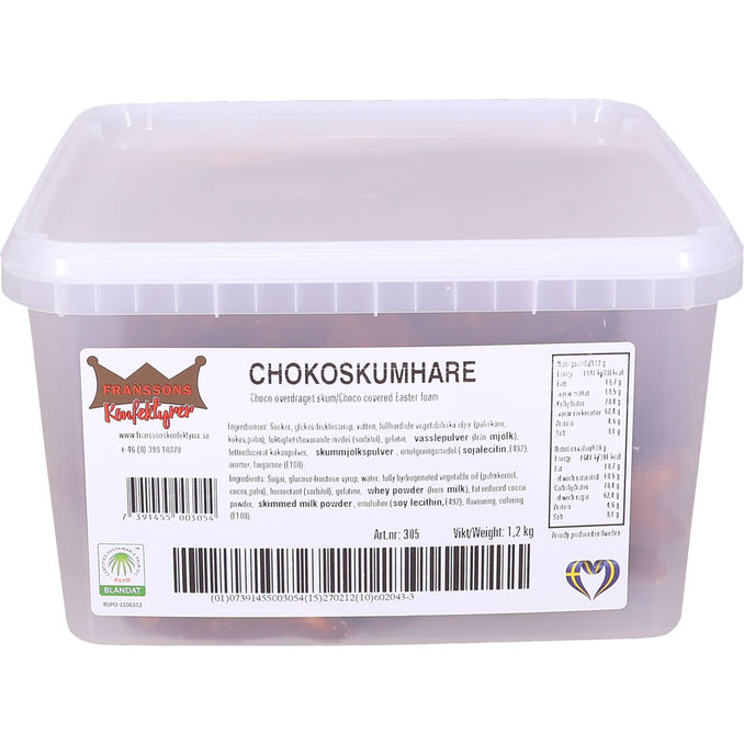 Sött skum möter len choklad! 🐰 Denna generösa hink på 1,2 kg fylld med chokladöverdragna skumharar är den ultimata gåvan till gottegrisen eller perfekt att dela med nära och kära. 🍫✨