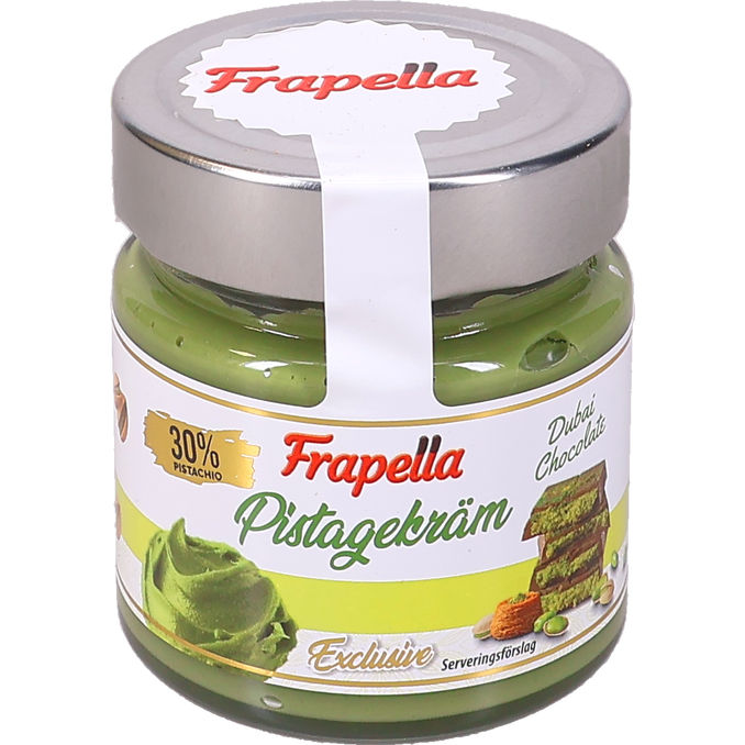 Upplev en smak av Dubai med Frapella Pistagekräm på 220g! 💚 En exklusiv och silkeslen kräm med hela 30% pistage som passar perfekt till bakning, desserter eller direkt på mackan. 🌿✨