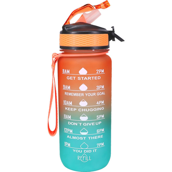 Praktisk vattenflaska med tydliga tidsmarkeringar och motiverande text som hjälper dig att hålla koll på ditt dagliga vätskeintag. Läckagesäker design med sportlock och bärrem gör den perfekt för träning, arbete och vardag.