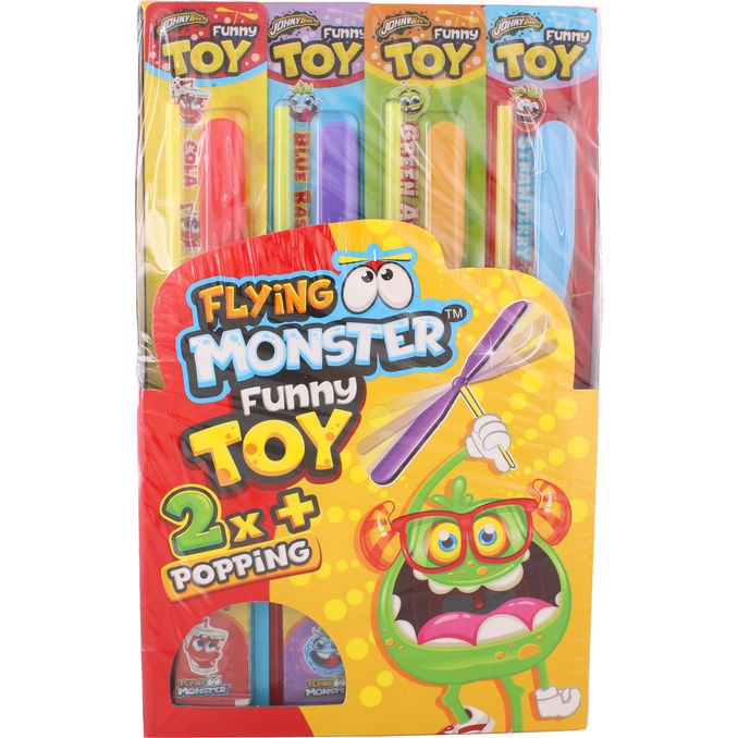 Roligt godispaket där varje enhet innehåller ett flygande leksakshjul och två påsar poppande pulvergodis i fruktiga smaker som äpple, jordgubb, blå hallon och cola. Perfekt som mix godis och leksak på kalas, i godispåsar eller som underhållande snack för barn.