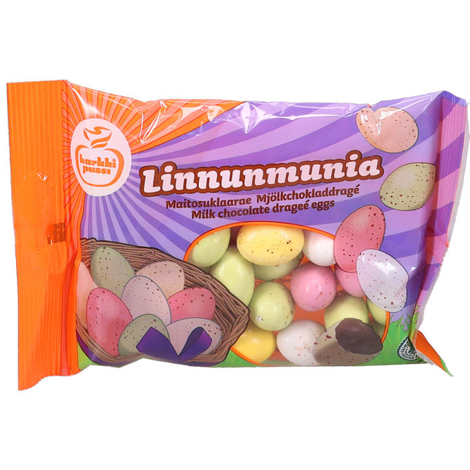 Linnunmunia är färgglada dragéägg fyllda med len mjölkchoklad och täckta med ett krispigt sockerskal. Perfekta till påskfirandet eller som en festlig godispåse med minst 25 procent kakao och minst 14 procent mjölk i chokladen.