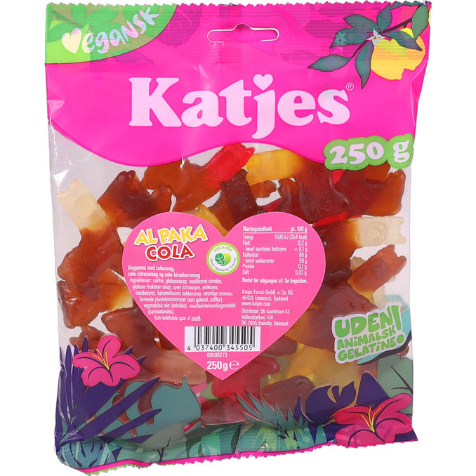 Svalka smaklökarna med Katjes Alpaka Cola! 🦙 Dessa veganska vingummin bjuder på en läskande mix av cola, citrus och körsbär. Helt utan animaliskt gelatin i en generös påse på 250 g! 🥤🍒