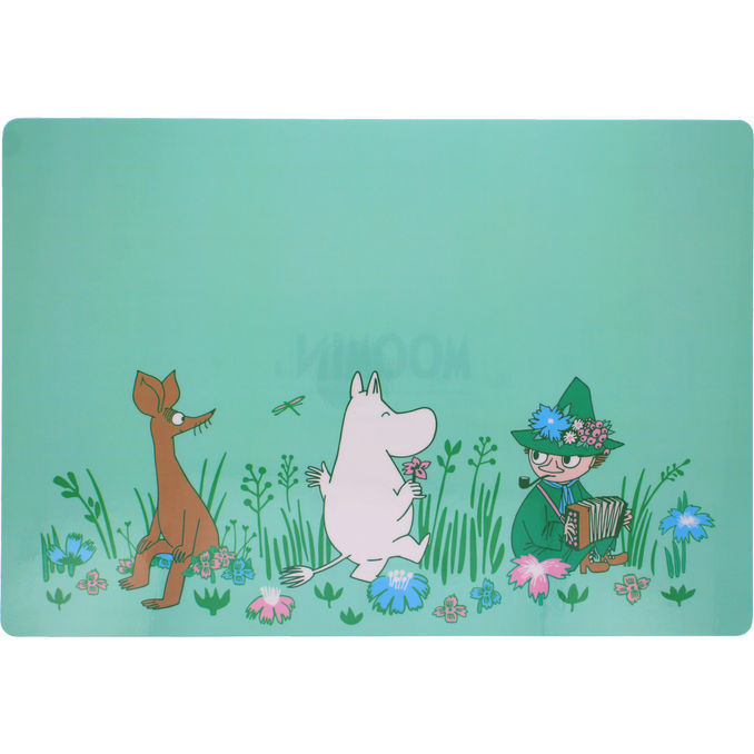 Grön rektangulär bricka med lekfullt Muminmotiv som skapar en glad och tidlös känsla i hemmet. Tillverkad i Sverige av slitstark och miljövänlig PET plast som passar perfekt för både servering och vardagsbruk. 40 × 27,5 cm.