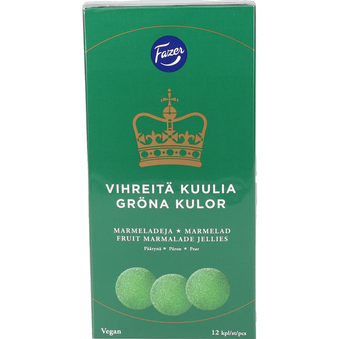 Veganska Gröna kulor från Fazer är en underbar marmeladklassiker. Lyxiga och söta Gröna kulor har en läcker smak av fräscht päron.