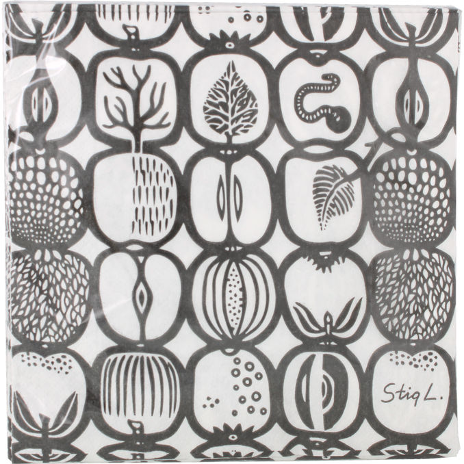 Dessa servetter från Opto Design med Stig Lindbergs ikoniska Fruktlåda-design är tillverkade i svenskt papper och kommer i ett praktiskt 20-pack, vilket gör dem idealiska för både vardagsdukning och festliga tillfällen. Deras stilfulla svart-vita motiv ger dukningen ett elegant och tidlöst uttryck samtidigt som de är funktionella och absorberande.
