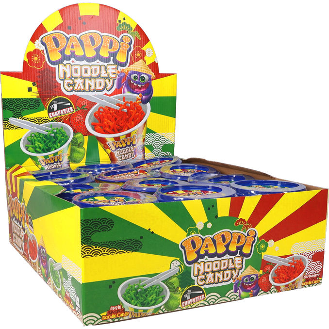 Ett lekfullt godisset där söta “nudlar” serveras i en rolig nudelliknande form. Godiset kommer i äpple- och jordgubbssmak i praktiska förpackningar som gör det enkelt att dela med vänner eller ha som favorit i godispåsen.