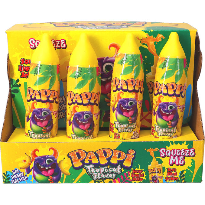 Ett 12-pack med smakrika squeezy-godisar i tropiska fruktsmaker för en färgstark och söt smakupplevelse. Godiset kommer i praktiska små förpackningar som gör det enkelt att njuta av en fruktig godisstund hemma, på fest eller när du är på språng.