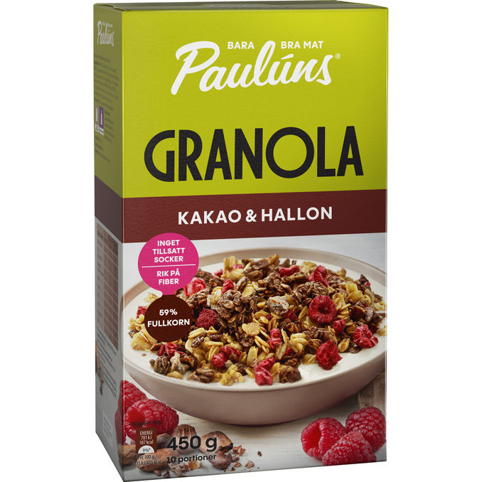 Fiberrik och knaprig granola med kakao, hallon och dadlar. Helt utan tillsatt socker. Med denna granola får du en perfekt start på dagen!