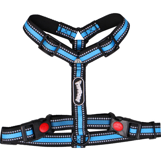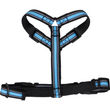 Justerbar hundsele i slitstarkt material med blåa och svarta remmar samt reflekterande detaljer för ökad synlighet i mörker. Selen har praktiska spännen och en metallring för koppel som gör den bekväm och säker för dagliga promenader.