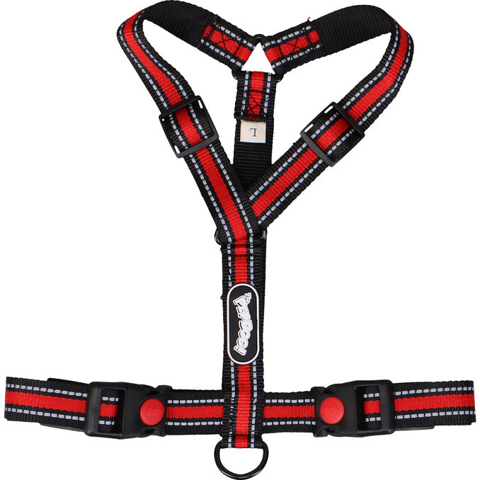 Justerbar hundsele i slitstarkt material med röda och svarta remmar samt reflekterande detaljer för ökad synlighet i mörker. Selen har praktiska spännen och en metallring för koppel som gör den bekväm och säker för dagliga promenader.