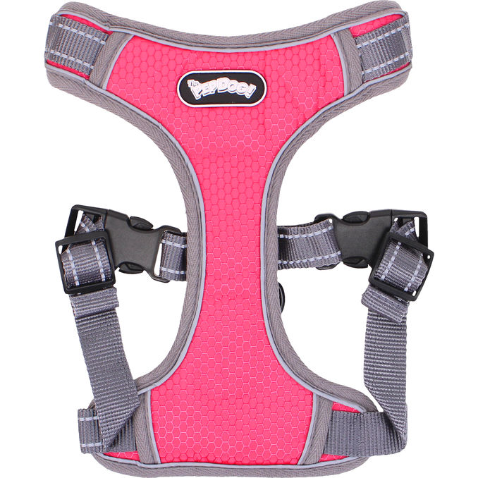 Bekväm hundsele i mjukt och vadderat material med rosa framsida och justerbara grå remmar för en säker passform. Selen har praktiska snabbspännen och reflexdetaljer som gör promenader både bekväma och säkra för din hund.