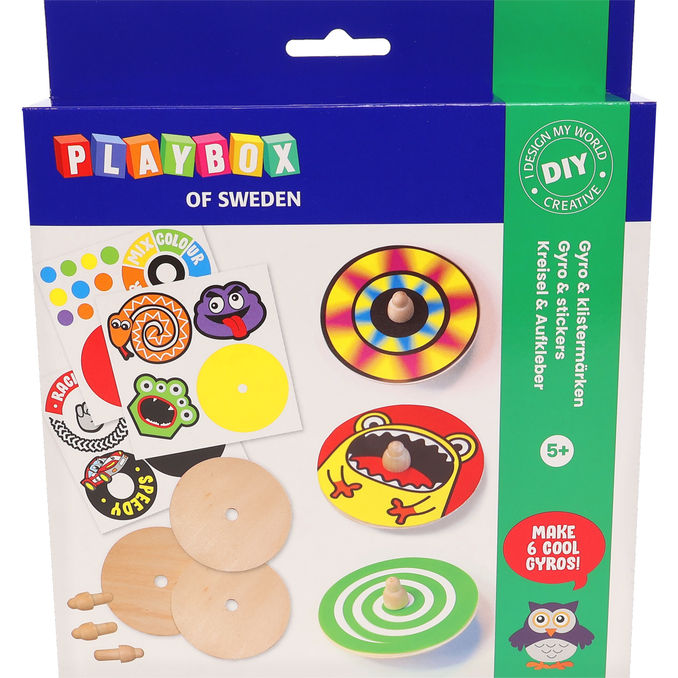 Ett kreativt pysselset med gyro och klistermärken för lekfullt hantverk där barn kan skapa egna snurror och dekorera dem med klistermärken och pärlor. Perfekt för att stimulera fantasi och finmotorik i pysselstunden.