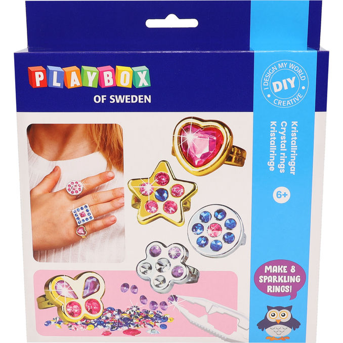 Skapa glittrande ringar med detta kreativa pysselset från Playbox of Sweden. Setet innehåller 8 ringar, pincett, lim och 270 färgglada kristaller som barn kan dekorera egna smycken med, perfekt för fantasifull pysselstund som tränar kreativitet och finmotorik.