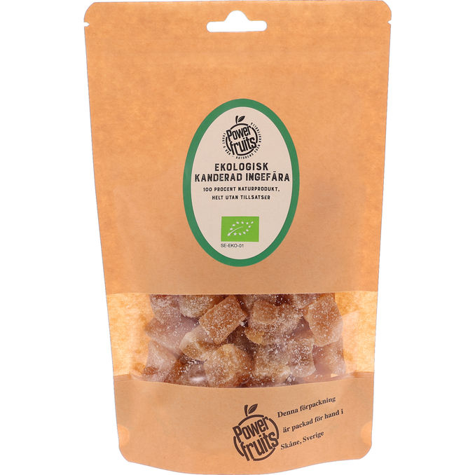 Torkad kanderad Ingefära i kuber som har en stark och söt smak. Ät direkt ur påsen eller som ett gott snacks.