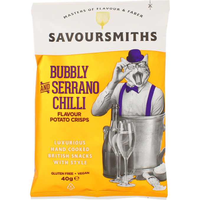 Upptäck ett unikt snacks med Savoursmiths Bubbly & Serrano Chili Potato Crisps. Ett lyxigare chipsalternativ där den spritsiga känslan från bubbly (vinets bubblor) möter en värmande kick av serrano-chili. Mini-påse 40g.