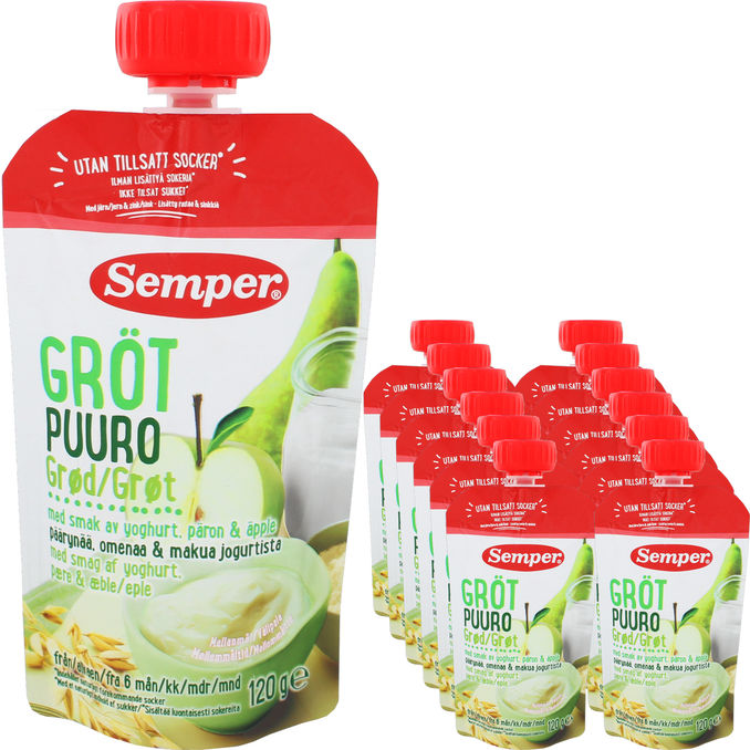 Denna Semper Gröt med Yoghurt Äpple & Päron 12-pack är ett näringsrikt och praktiskt mellanmål i klämpåse med mild yoghurt och fruktig smak av päron och äpple som gör den enkel att äta utan kladd. Produkten är utvecklad för barn från cirka 6 månaders ålder och innehåller bland annat järn, kalcium och vitamin C för att bidra till barnets dagliga näringsbehov.