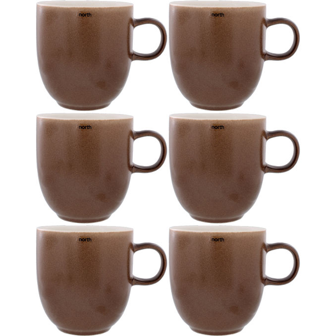 Set med sex muggar i serien North från Studio Round med rundad form och reaktiv glasyr som gör varje mugg unik med naturliga nyanser inspirerade av naturens struktur. Muggarna är tillverkade i slitstarkt stengods som tål både vardaglig användning och maskindisk, perfekt för kaffe, te eller varma drycker.