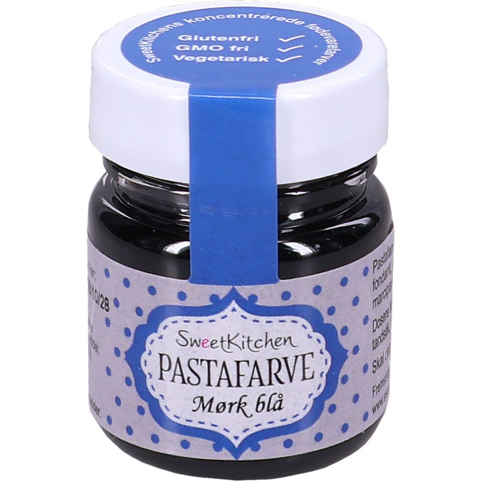 SweetKitchen pastafärg mörkblå är en koncentrerad livsmedelsfärg som används för att färga fondant, glasyr, grädde, marsipan och andra bakdekorationer. Den kraftiga färgen gör det enkelt att skapa djupa nyanser genom att tillsätta små mängder i taget.