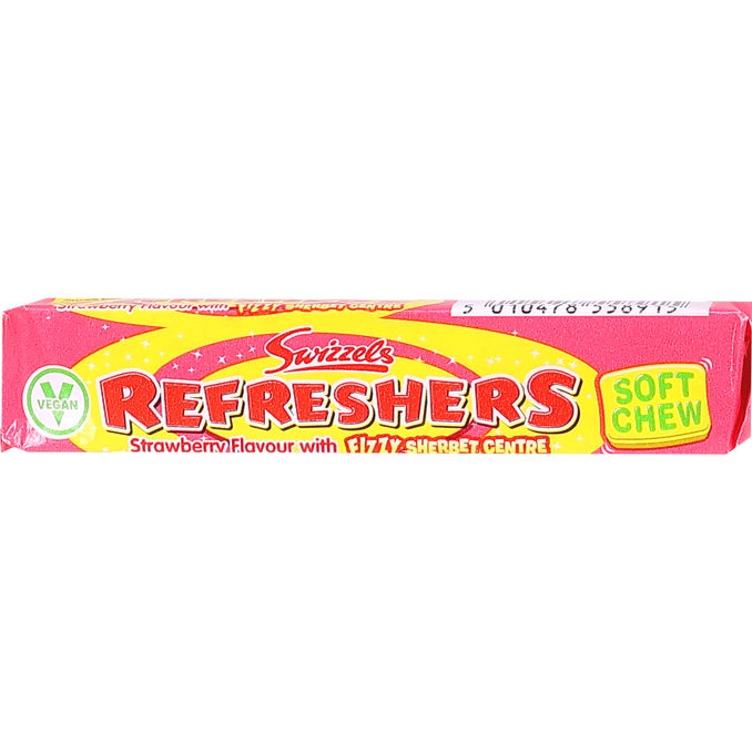 Swizzels Refreshers Soft Chew Strawberry är ett mjukt och segt godis med härlig jordgubbssmak och ett friskt brusande sherbetcenter. Den söta och syrliga kombinationen ger en klassisk smakupplevelse som passar perfekt när du vill ha ett lekfullt och uppfriskande godis.