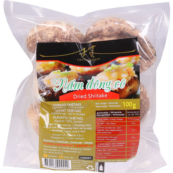 Torkad shiitakesvamp med fyllig umamismak som är perfekt i soppor, wok, nudelrätter och asiatiska grytor. Svampen blötläggs före användning och ger en djup, aromatisk smak som lyfter både vegetariska och köttbaserade rätter.