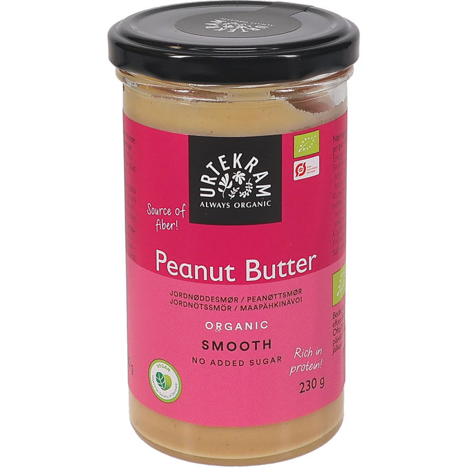 Urtekram Organic Smooth Peanut Butter är ett ekologiskt, veganskt jordnötssmör tillverkat av 99,5 % rostade jordnötter och en nypa salt, helt utan tillsatt socker eller onödiga tillsatser.