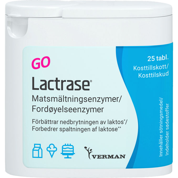Laktasenzym för spjälkning av laktos. Laktasenzym förbättrar nedbrytningen av laktos hos individer som har svårigheter att bryta ner laktos. Tabletten går att tugga, suga eller svälja.